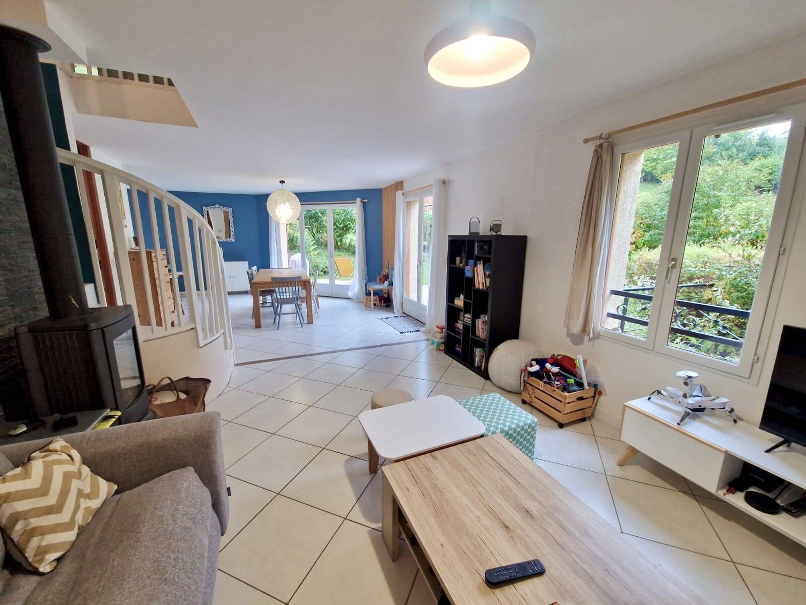 Espace de Vie Lumineux : Un vaste espace de vie ouvert comprenant un salon chaleureux et une cuisine équipée moderne. Profitez de soirées cosy autour du poêle à bois. Chambres & Bureau : 4 chambres confortables, un grand espace bureau modulable (possibilité 5ème chambre), une salle de bains et une salle d'eau, ainsi que deux toilettes indépendants.